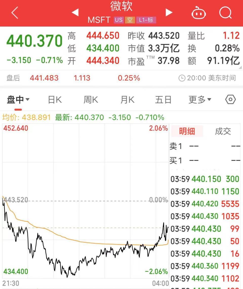 截至北京时间19日美股收盘,微软股价下跌0.71%。