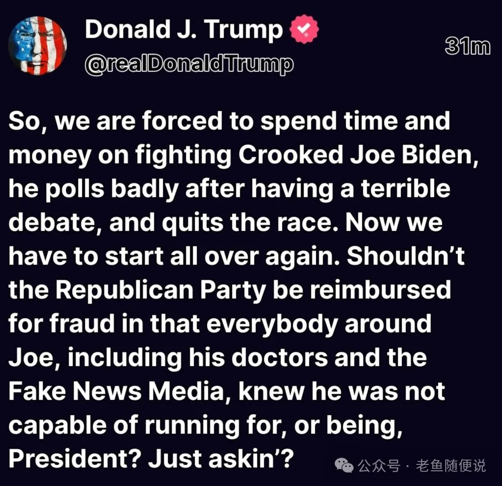 按理说,拜登退选,川普应该高兴才对。但川普和他的支持们却表现得有点懵逼,也许他们这些迷恋总统宝座的人,就没有想到一个人真的会主动退出总统选举。