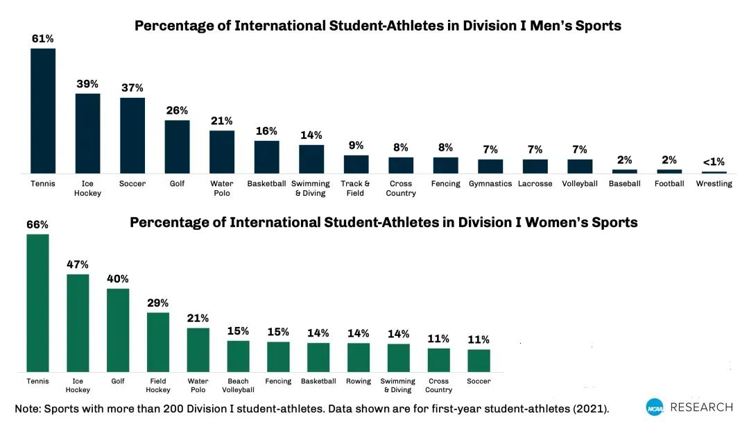 进入D1比例较高的男子橄榄球也只有2.8%,女子冰球只有4.1%;而比例最低的男子足球和女子网球更是低于1%。
