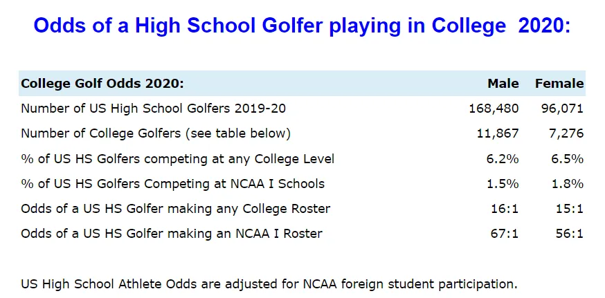2020年一份关于高尔夫的录取数据显示,高中参赛的男子有168,480人,女子有96,071人,能进入D1学校的只有1.5%和1.8%。
