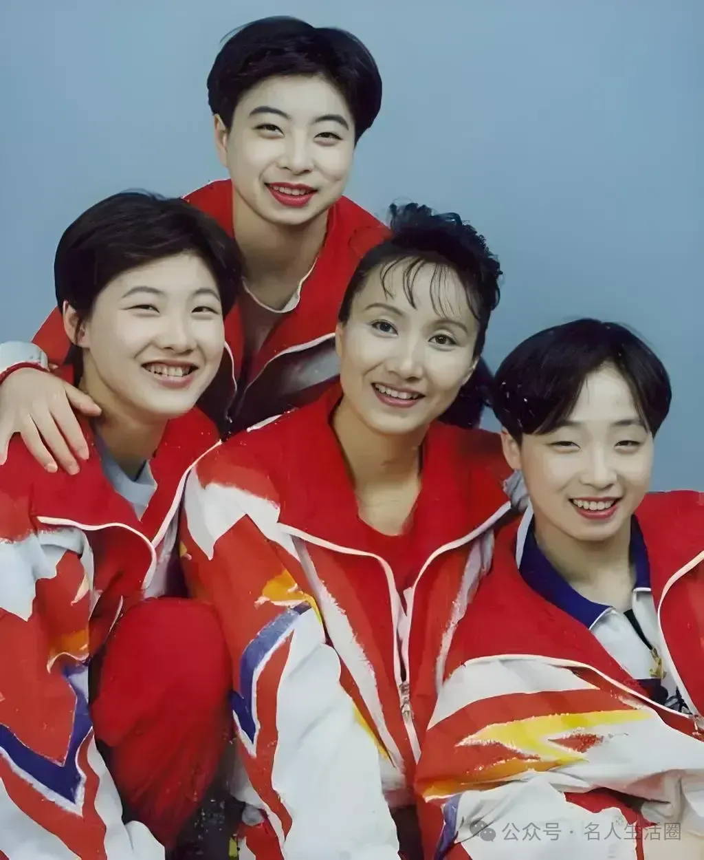 十四岁左右的郭晶晶与伏明霞和教练的合影,那时的郭晶晶还没有长开,梳着一头短发。难怪人们开玩笑时常说:“跳水队的短发姑娘都是狠角色”。