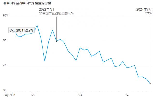 7月份,电动汽车和插电式混合动力汽车占中国汽车总销量的比例首次超过一半,而同期非中国品牌汽车对经销商的发货量占比从两年前的50%降至33%。