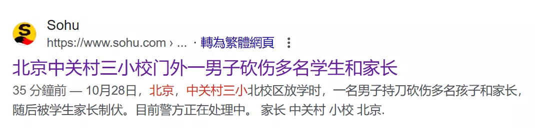 据搜狐网报道,10月28日,北京中关村三小北校区放学时,一名男子持刀砍伤多名孩子和家长,随后被学生家长制伏。不过该报道已被删除。