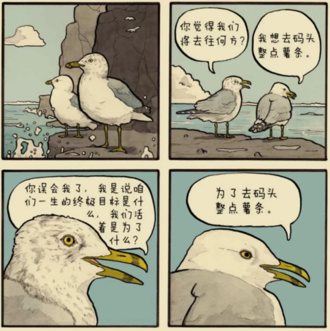 这其实很容易让人联想到,流行在网络上的一张梗图:一只海鸥问它的同伴:“我们该飞向何方?”同伴答曰:“去码头整?点薯条。”“你误会我了伙计,我说的是我们的终极目标。”“去码头整点薯条。”