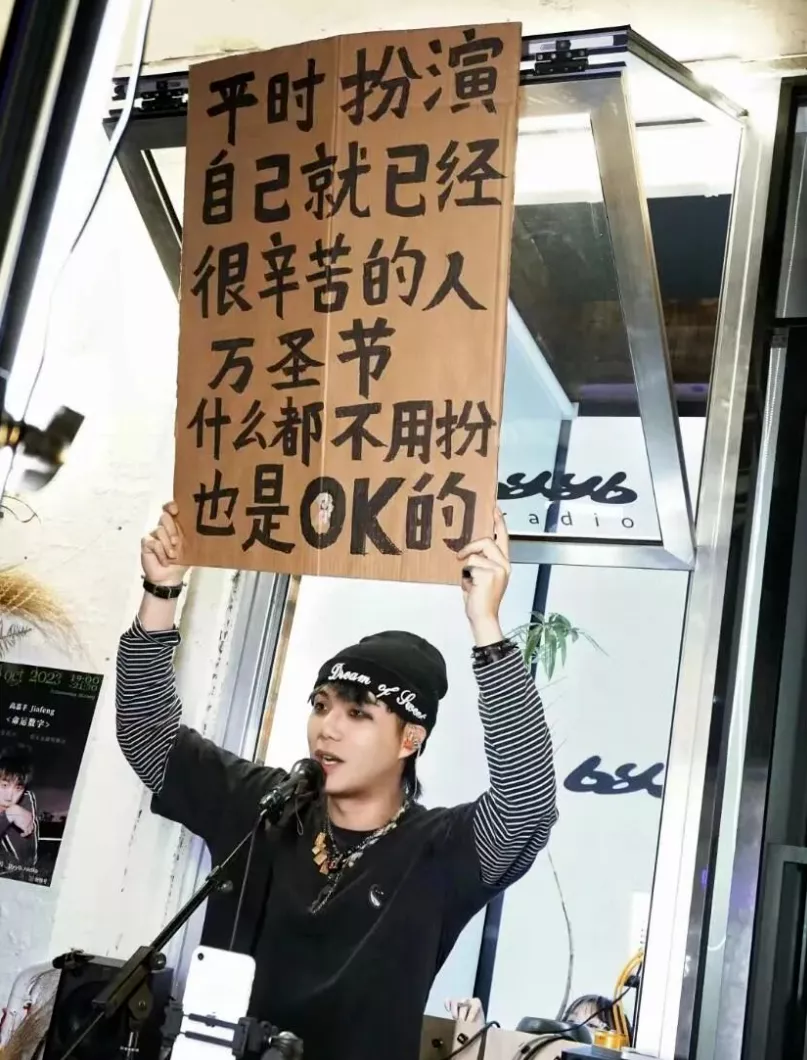 “平时扮演自己就很辛苦的人,万圣节什么都不用扮也是OK的。”有人在万圣节活动现场摆出这样的标语,让许多年轻人动容。