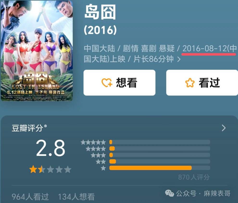2.8的低分,和乔任梁事件无关,8月上映时网友就打一星差评。