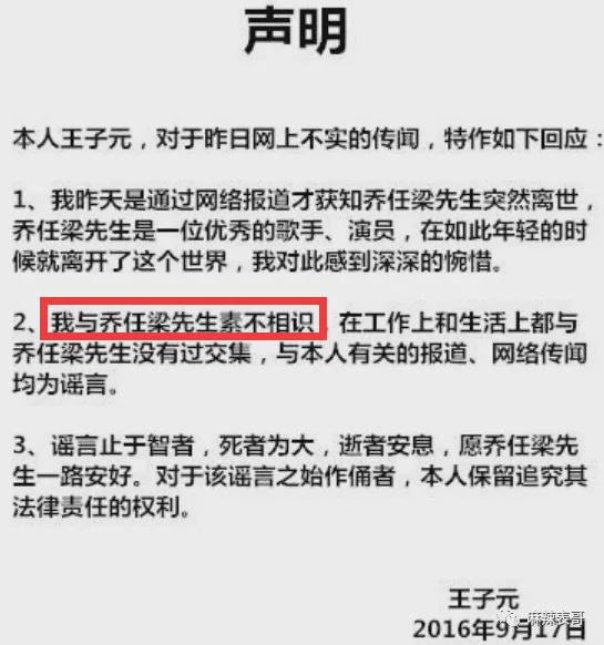 第二天,王子元发声明,说自己和乔任梁压根不认识。有人在造谣,他保留追究法律责任的权利。