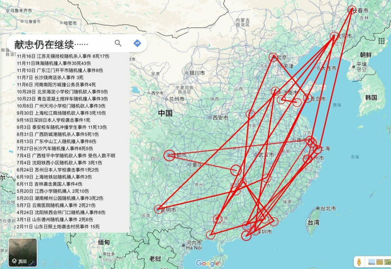 中国最近不断发生报复社会事件,让百姓人心惶惶。近期有网友将中国今年的报复社会事件详细列出,桉件数量多达 25 起,显示中国社会已病入膏肓。