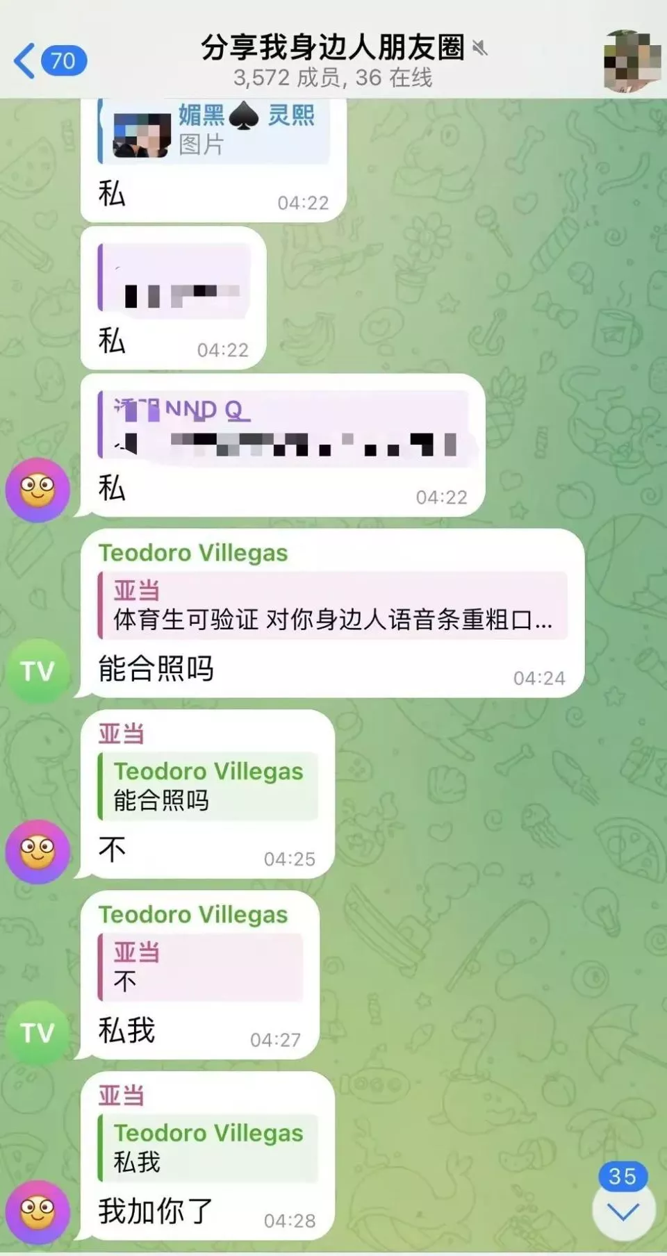 同一个账号用户,同时在多个群组活跃。每一天,加害者肆意在群组发布着女孩的照片和视频,几乎每隔两三分钟,就有人互动。每组照片被发出时,往往搭配着带有侮辱性的文字,他们自称女孩是自己的同学、同事、朋友、前女友、老婆等,诱导其他群成员一起辱骂和意淫。紧接着,立马就会有几个账号回复,“私”。