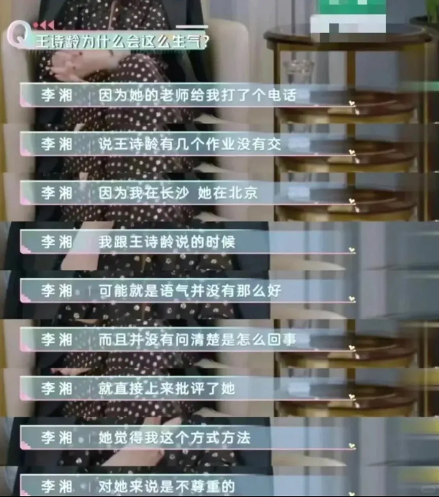 李湘的回答是,“当时我在长沙,她在北京,老师给我打电话说她有几个作业没交,我和王诗龄说的时候可能语气没那么好,王诗龄就觉得不够尊重她。”