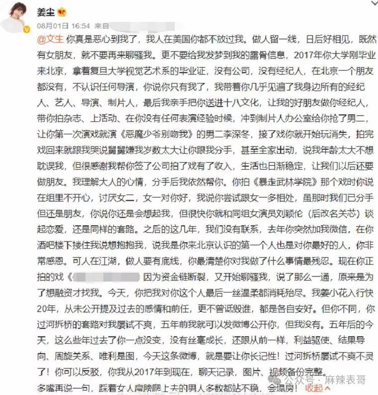 说她当初帮文生介绍制片人、导演,让好友给文生做经纪人,结果文生一上岸就提分手。