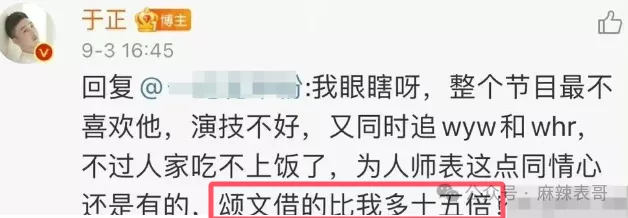 之前,节目上一个选手赵天宇问于正、张颂文借钱,迟迟没还,于正气得在微博上阴阳怪气,于正说颂文借的比他多十五倍。