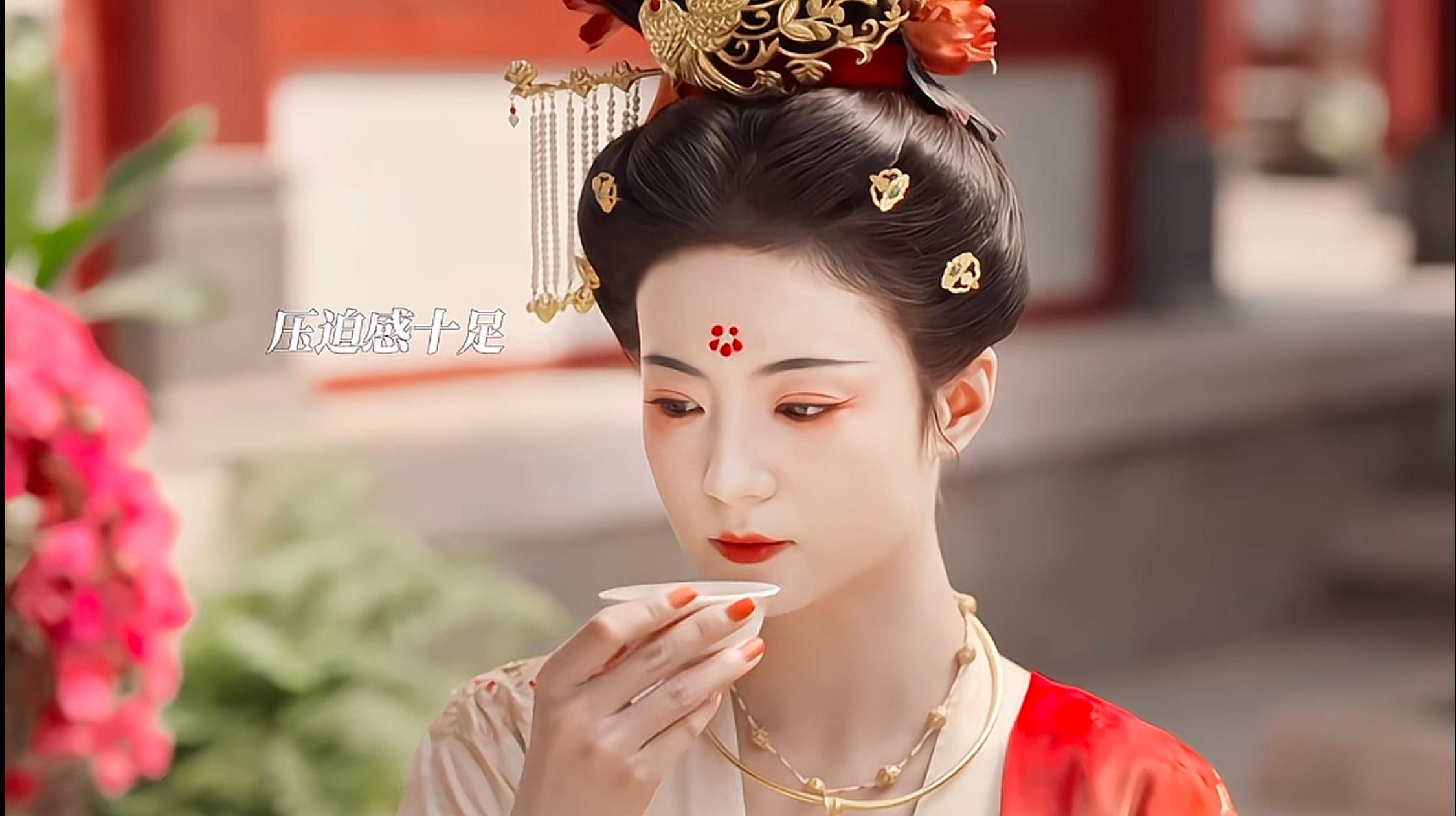 她头上的发型类似于唐朝的回鹘髻,比女主角杨紫的发髻还要高,且中间用红色牡丹或者金色凤凰装饰,显得更加矜贵,令人过目不忘。