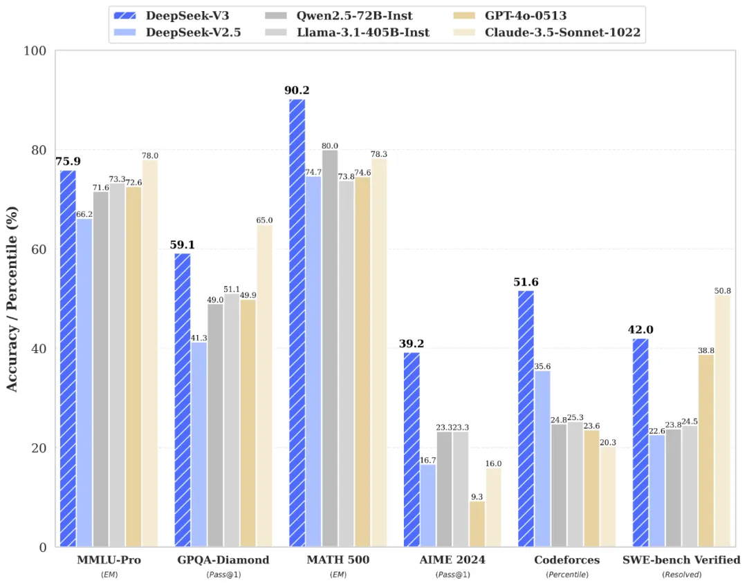 DeepSeek-V3多项评测成绩超越了Qwen2.5-72B和Llama-3.1-405B等其他开源模型,并在性能上和世界顶尖的闭源模型GPT-4o以及Claude-3.5-Sonnet不分伯仲。