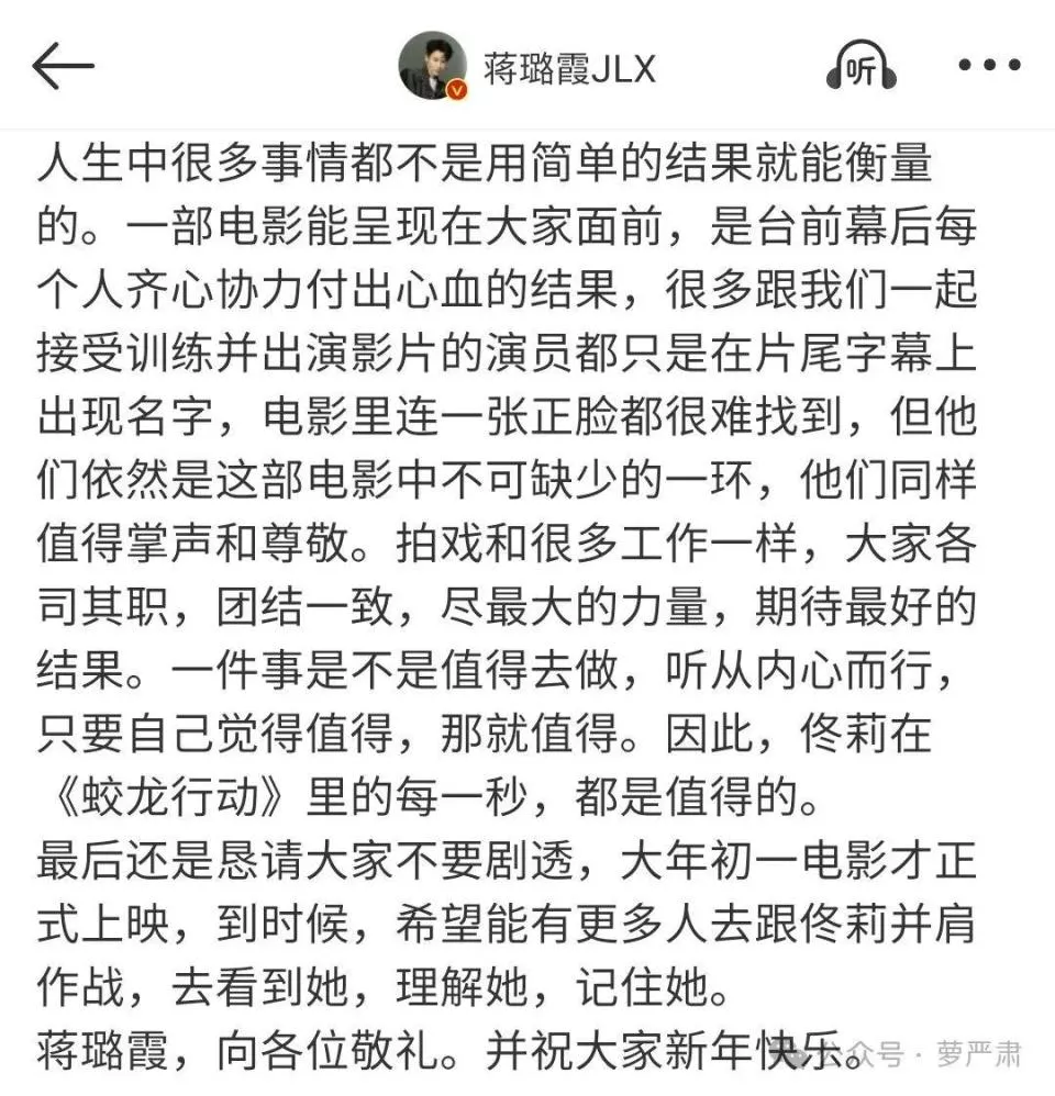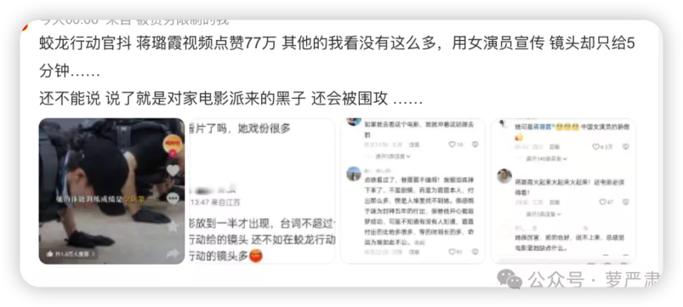 爭議中蔣璐霞自己發了長微博,意思就是她確實認真訓練了也確實才知道角色犧牲了但是電影還是好的。各位其他演員轉發制造出一種相親相愛一家人的畫面。呃……這不是觀感更差了嗎?