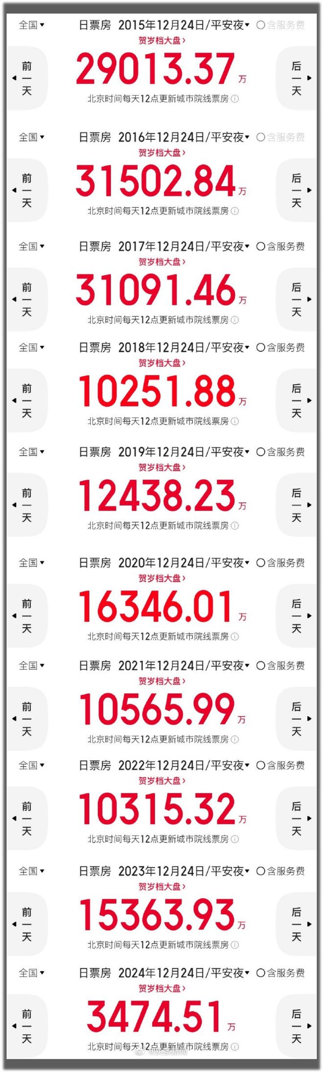 平安夜那天,这张图刷屏了,那会儿挺多人看衰春节档,表示春节也不会太好的,包括我在内的很多人都觉得电影行业完了。