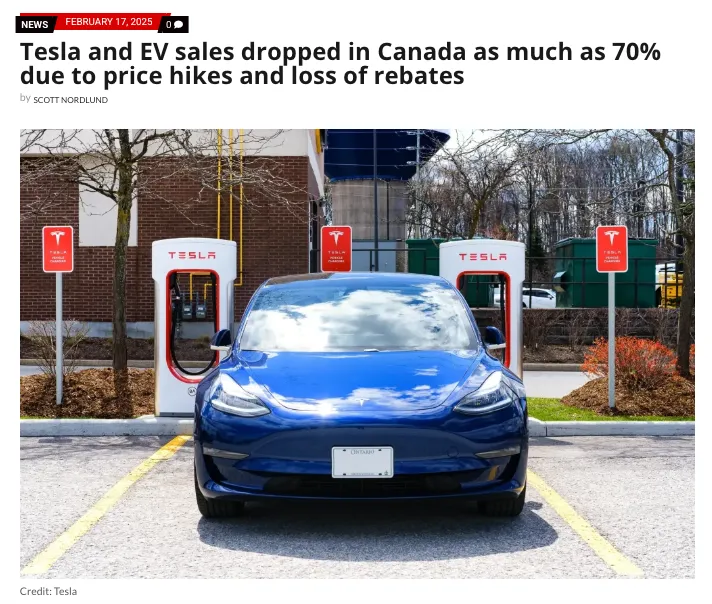 更直观的是数据。 最新调查显示,特斯拉 2025 年初在加拿大的销量暴跌了 70%,这是该品牌进入加拿大市场以来最大幅度的下滑。