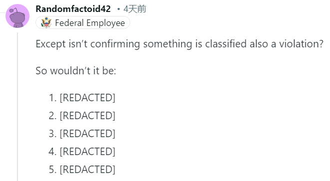 图自Reddit论坛在北美流行的Reddit红迪论坛上,一位标记为“联邦雇员”的网友调侃,“确认什么东西是机密也是违规的吧?所以这些(周报)应该是1.[删除]2.[删除]3.[删除]4.[删除]5.[删除]。”就在联邦雇员们为那封邮件人心惶惶时,广大网友却开启了“欢乐模式”。