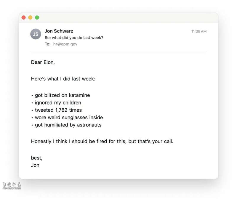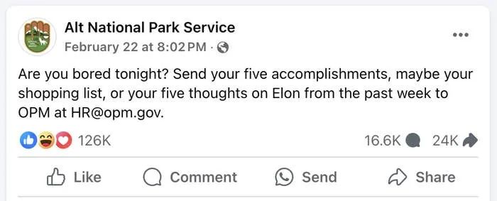 有网友发现似乎任何人都能往人事管理办公室的官方邮箱发邮件,甚至可能直接送到马斯克本人手里!这一发现瞬间点燃了网友的创作热情。邮件发出的当晚,脸书上一个名为“另类国家公园管理局”(Alt National Park Service)的“抵抗组织”页面就发帖调侃:“今晚无聊吗?给埃隆的HR@opm.gov发五条你的‘工作成果’吧!可以是购物清单,也可以是你的五个奇思妙想!”