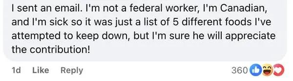 图源|脸书@Alt National Park Service甚至连隔壁加拿大的网友也跑来凑热闹:“我也发了一封邮件,虽然我不是联邦雇员,还是个加拿大人,上周还生病了,但我还是列出了五种我能吃得下的食物。我相信他会感谢我的回复!”