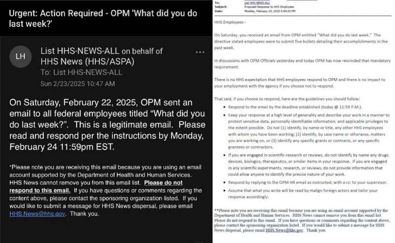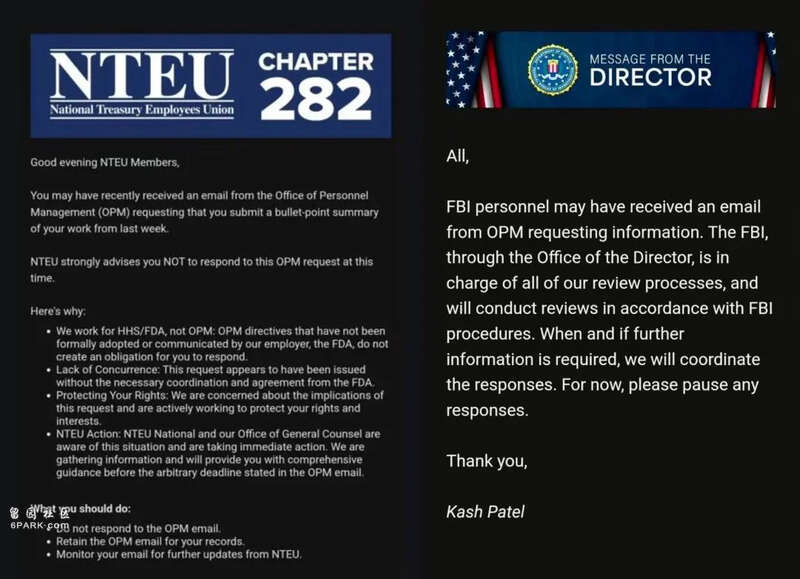 美国财政部雇员工会和美国联邦调查局局长卡什·帕特尔(Kash Patel)发在内部的通知。图源:X美国卫生与公共服务部的情况更为复杂:其雇员称最初收到的通知要求回复邮件,但周日晚上又收到第二封邮件,称暂停回复并等待进一步通知;到了周一,通知则变成了不强制要求员工回复,且不回复不会影响雇员的任职。