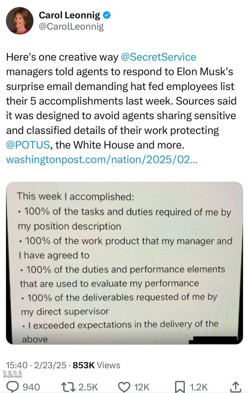 美国卫生与公共服务部发给内部员工提供了回复指引。最后一句是“需要假定你所写的内容会被恶意的外国行动者阅读或剪裁” 图源:Threads/@luckytran据美国华盛顿邮报》记者卡罗尔·莱昂尼格观察,特勤局的回复比较有创意: