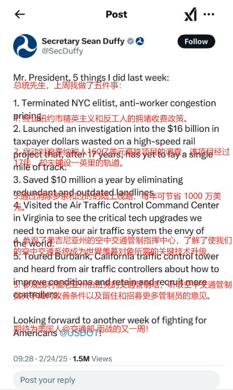 总统先生,上周我做了五件事:1.终止纽约市精英主义和反工人的拥堵收费政策。2.启动对浪费纳税人160亿美元高铁项目的调查,该项目经过17年,却未铺设一英里的轨道。3.通过消除多余和过时的陆地线路,每年可节省1000万美元。4.参观了弗吉尼亚州的空中交通管制指挥中心,了解了使我们的空中交通系统成为世界羡慕对象所需的关键技术升级。 5.参观加利福尼亚州伯班克的交通管制塔,听取空中交通管制员关于如何改善条件以及留住和招募更多管制员的意见。期待为美国人@USDOT(美国交通运输部)而战的又一周!以及退伍军人事务部长道格·柯林斯(Doug Collins)的回复,除了表态之外,他还直接@了总统: