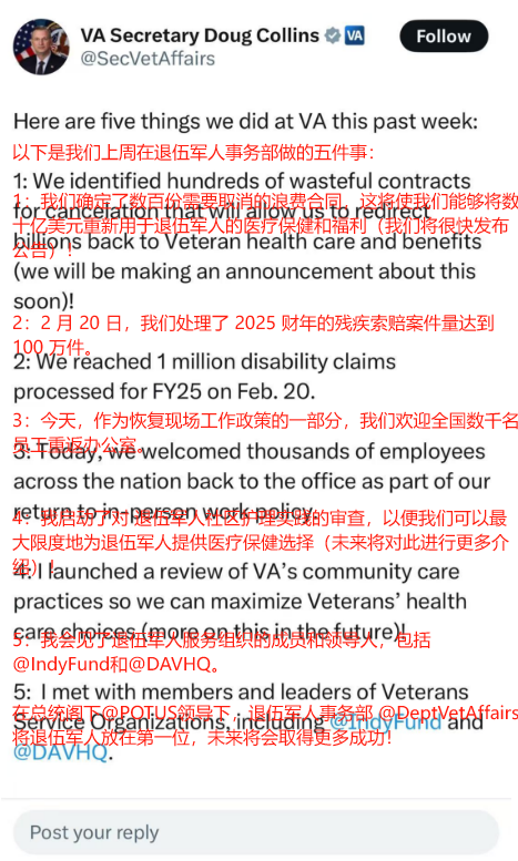 以下是我们上周在退伍军人事务部做的五件事:1:我们确定了数百份需要取消的浪费合同,这将使我们能够将数十亿美元重新用于退伍军人的医疗保健和福利(我们将很快发布公告)!2:2月20日,我们处理了2025财年的残疾索赔案件量达到100万件。3:今天,作为恢复现场工作政策的一部分,我们欢迎全国数千名员工重返办公室。4:我启动了对本部社区护理实践的审查,以便我们可以最大限度地为退伍军人提供医疗保健选择(未来将对此进行更多介绍)!5:我会见了退伍军人服务组织的成员和领导人,包括@IndyFund和@DAVHQ。