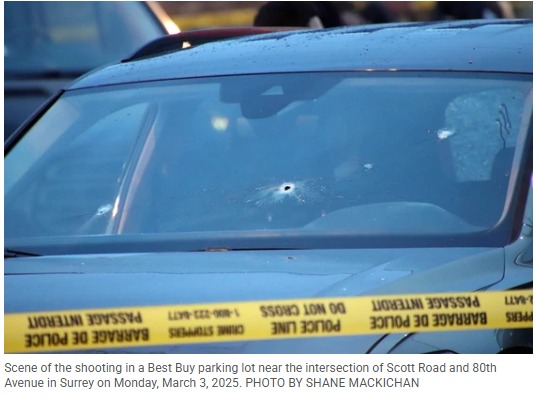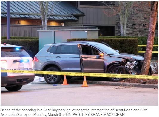 素里警察局警官 Lindsey Houghton 周一晚些时候告诉 Postmedia News,周一下午晚些时候,紧急服务部门接到了来自 Scott Road 和 80th Avenue 附近“非常繁忙”地点的几个电话。报告称一名车辆司机在十字路口东南角的室外停车场被枪击。