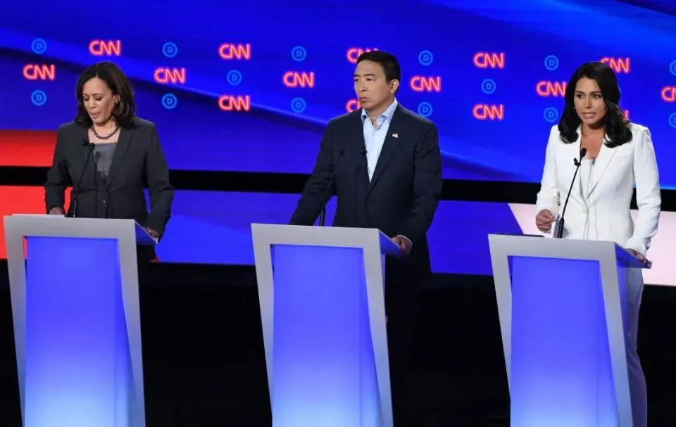 ·2019年,加巴德(右)与哈里斯(左)参加民主党总统候选人辩论。