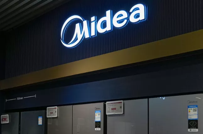 图为中国美的集团标志及其生产的冰箱。包括美的在内的多家中国企业掀起反内卷潮。