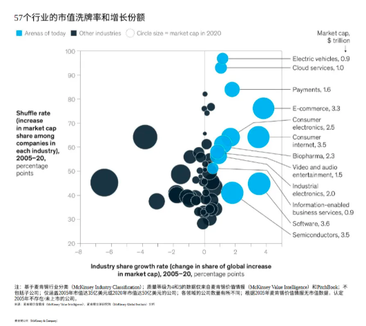 在這些行業裡,“洗牌率”,也就是各家公司,在業內增加的份額之和,收入方面達到了49%,其他行業為32%。市值方面,洗牌率為66%,而其他行業為47%。這,是高活力。