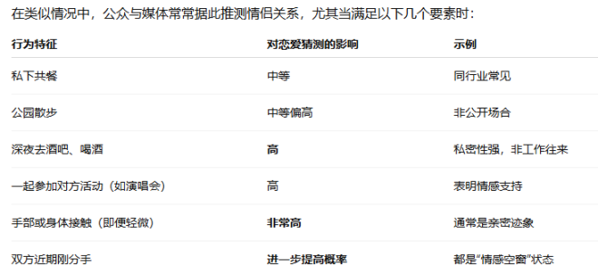 通過ChatGPT對已公開信息的推算,兩人存在戀情的概率為50%-70%。雖然他們本人未確認關系、也沒有公開親密行為(如牽手、接吻),但按照以往類似事件經驗來看,這類頻繁私下接觸 + 情感空窗期 + 特魯多手扶對方腰部的細節,確實顯著提高了戀愛的可能性。
