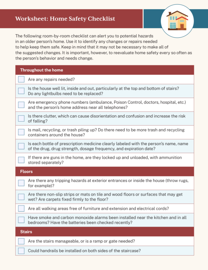 个人护理:协助日常生活活动,包括洗澡、穿衣、如厕、进食和行动。家务:打扫房间、庭院劳动、采购杂货、洗衣及类似的家务。餐饮:购买食材并准备营养餐食。财务管理:如支付账单、填写医疗保险表格等任务。医疗护理:包括给药、处理伤口、协助使用医疗设备及物理治疗。交通:出行协助,例如前往诊所或杂货店。安全:家庭安全措施,以及在跌倒或其他紧急情况下提供帮助。也有许多与家庭环境相关的注意事项——下面这份检查表就是用来逐项排查,留意家中不适合居住的细节问题——大到房屋需要修缮的地方、安装扶手的位置;小到药物是否贴有清晰标签、厨房是否安全、院子是否需要维护等。