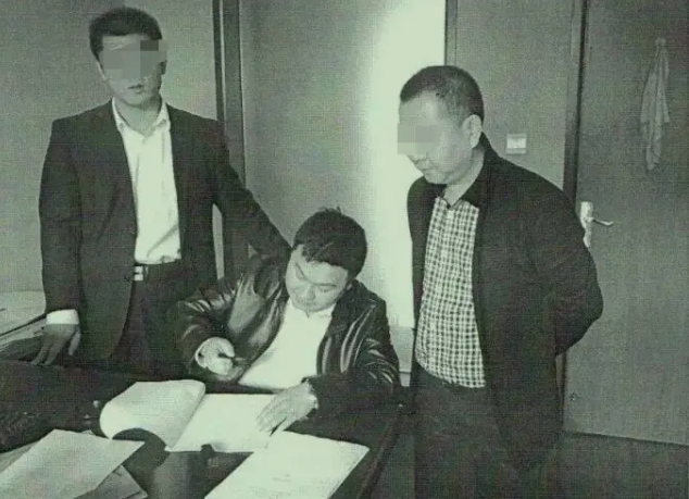 乐山市商业银行两名工作人员与假冒担保方银行工作人员的殷学明(中)在“面签”现场。受访者提供 资料图