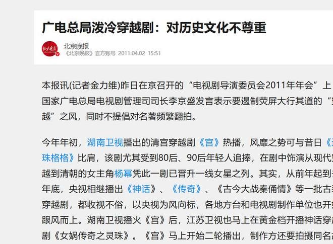 另外在2011年4月,多家官方媒體發表一篇名為《廣電總局狠批穿越劇不尊重歷史觀 停審四大名著》的文章。