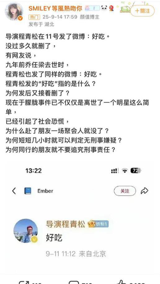 时评人士李大宇在其自媒体节目中指出,被传涉案的程姓导演在于朦胧死亡当天发了两个字的微博“好吃”,稍后又删掉。2016年另一名男星乔任梁惨死时,此人也有同样的操作。