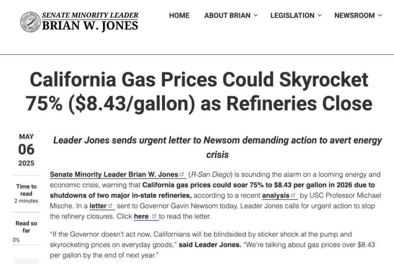 USC教授Michael Mische表示,根据模型预测,在两家炼油厂关闭以后,油价可能会在2026年中期突破$8/加仑。