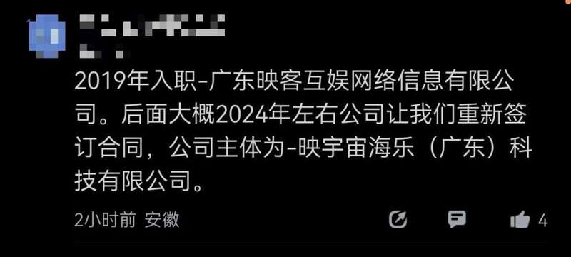 据网友爆料,该员工2019年8月入职广东映客互娱网络信息有限公司(爆料人称该公司系北京映客直播子公司),随后于2024年重新与新的公司主体,“映宇宙海乐(广东)科技有限公司”,签订劳动合同,主要负责社交直播项目。