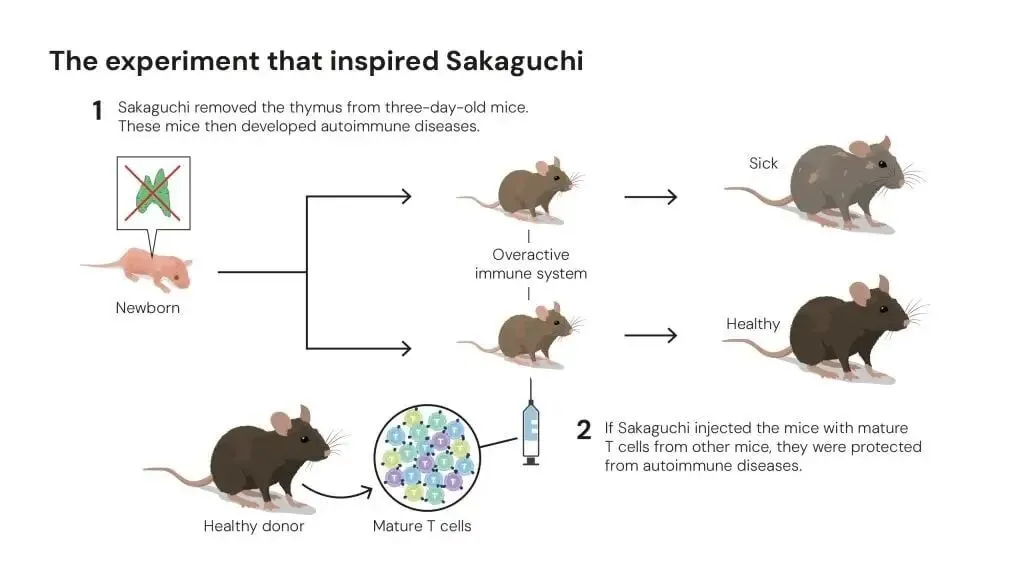 他受到一项早期实验的启发:为了研究胸腺在T细胞发育中的作用,研究人员切除了新生小鼠的胸腺。他们原本以为小鼠会产生更少的T细胞,免疫系统会变弱。