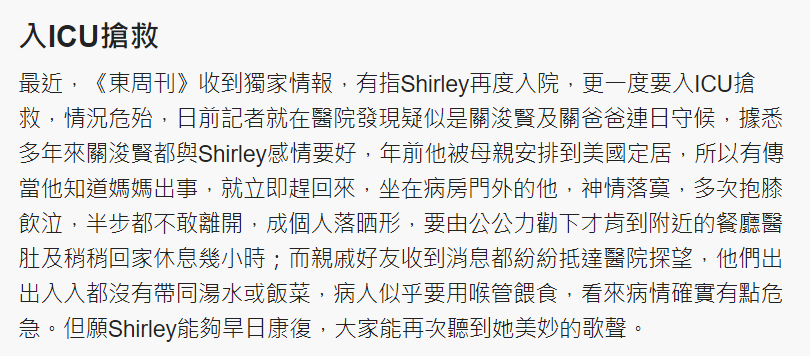 港媒報道,消失多年的樂壇天後關淑怡(Shirley),突然入院,更一度被送進ICU搶救,情況令人擔憂。