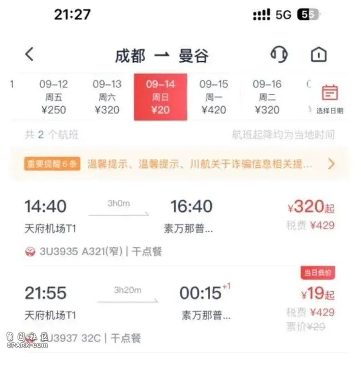 9月14日21时55分从成都飞曼谷的票价为19元起/图源:社交媒体截图