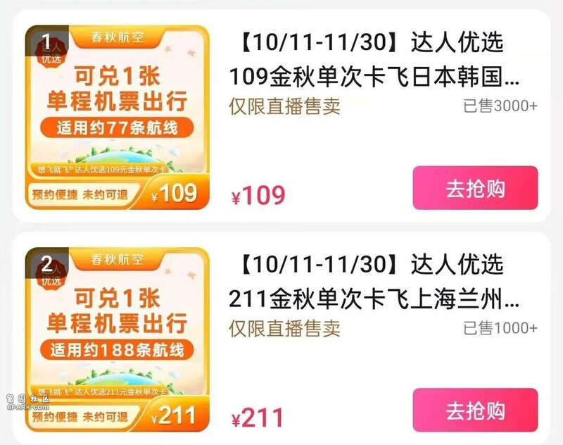 近来,她又囤了几张深圳航空、四川航空、东方航空、南方航空的次卡。张萍觉得从直播间买机票次卡的优点,一是价格确实比OTA平台便宜,二是只要没成功兑换都可以全额退款。