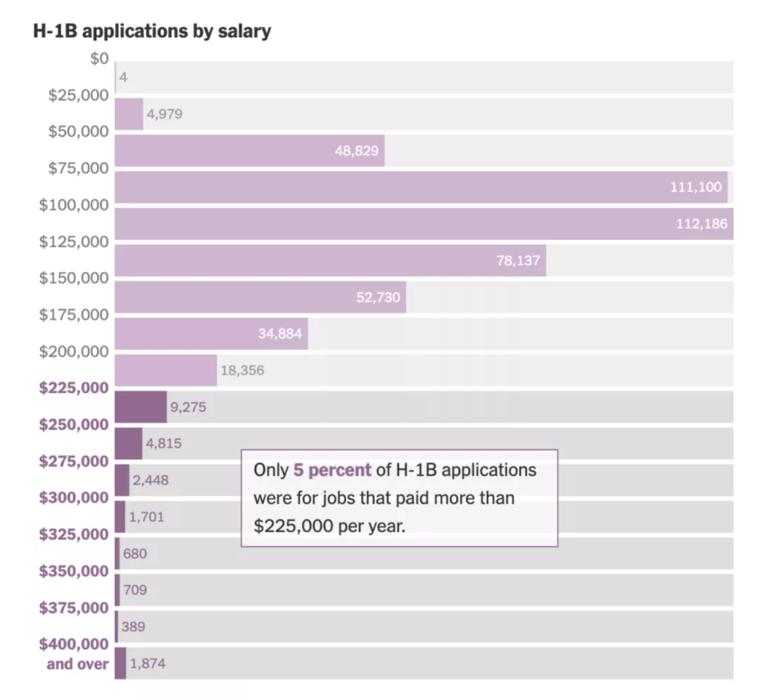 大部分岗位的薪资都低于三年期平衡所需的22.5万美金,只有5%的H-1B工资超过了这个数字。