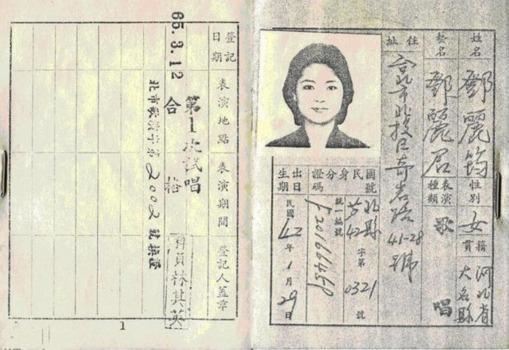 鄧麗君的歌唱演員證。(圖/翻攝維基百科)