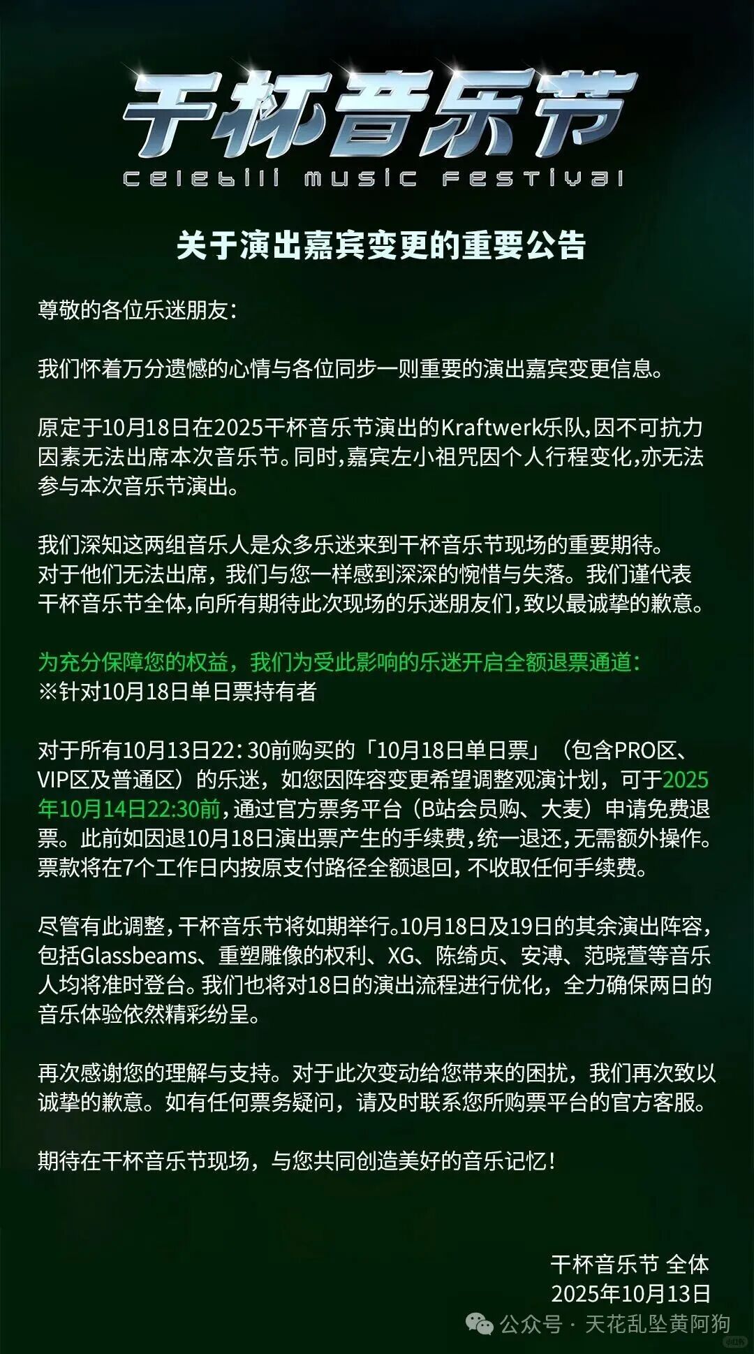 刚才,上海干杯音乐节的组织方bilibili发了公告,宣称由于“不可抗力”,原定邀请的德国Kraftwerk乐队及音乐人左小祖咒,将无法按原计划参加18号的演出。