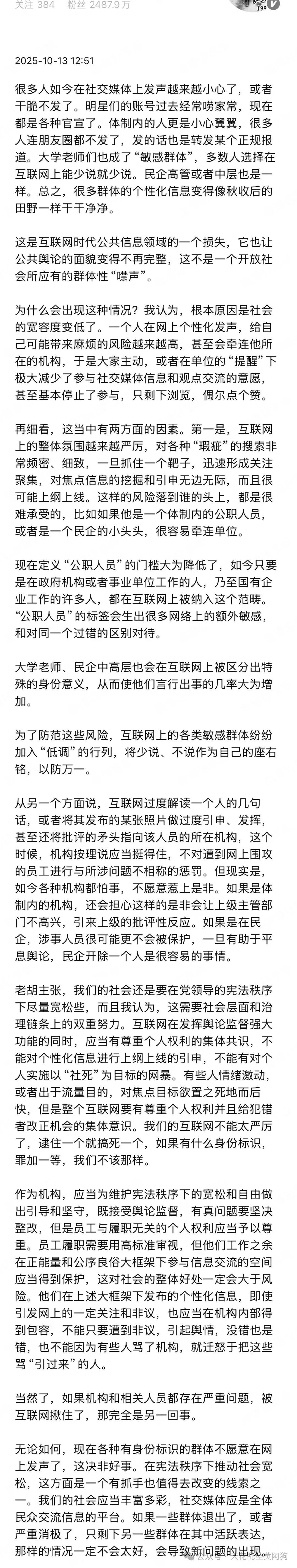 “很多人如今在社交媒体上发声越来越小心了或者干脆不发了。这是互联网时代公共信息领域的一个损失,他认为根本原因是社会的宽容度变低了。一个人在网上个性化发声,给自己可能带来麻烦的风险越来越高,甚至会牵连他所在的机构,于是大家主动,或者在单位的“提醒”下极大减少了参与社交媒体信息和观点交流的意愿,这当中有两方面的因素,首先是互联网上的整体氛围越来越严厉,而且很可能上纲上线。另一个方面说,互联网过度解读一个人的几句话,或者将其发布的某张照片做过度引申、发挥,甚至还将批评的矛头指向该人员的所在机构,各种机构都怕事,不愿意惹上是非。无论是公有或者私有的单位,都不会保护你。