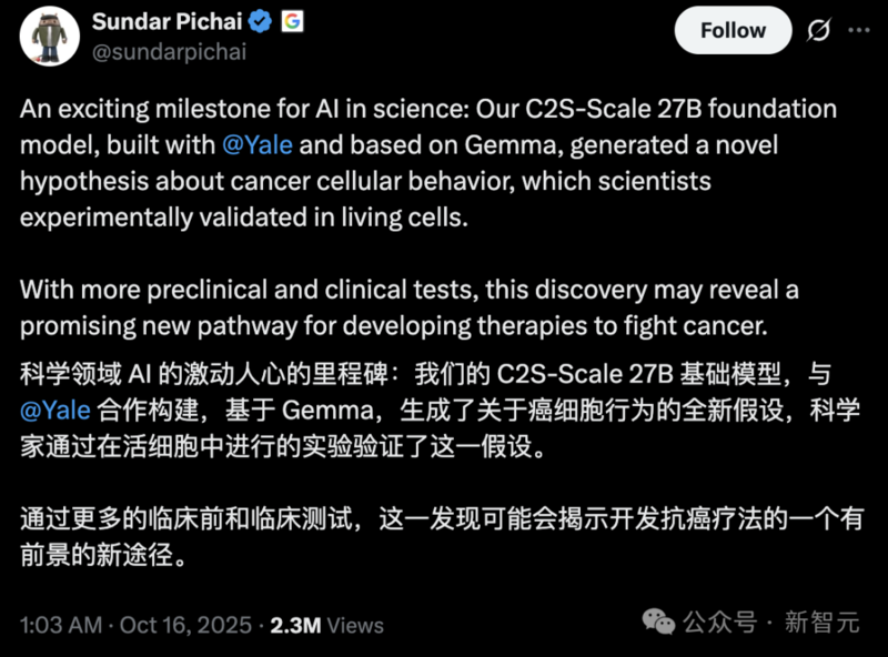 近日,谷歌与耶鲁大学联合发布的大模型C2S-Scale,首次提出并验证了一项全新的「抗癌假设」。这一成果表明,大模型不仅能复现已知科学规律,还具备生成可验新科学假设的能力。刚刚,AI科学应用领域又有一件大事发生!