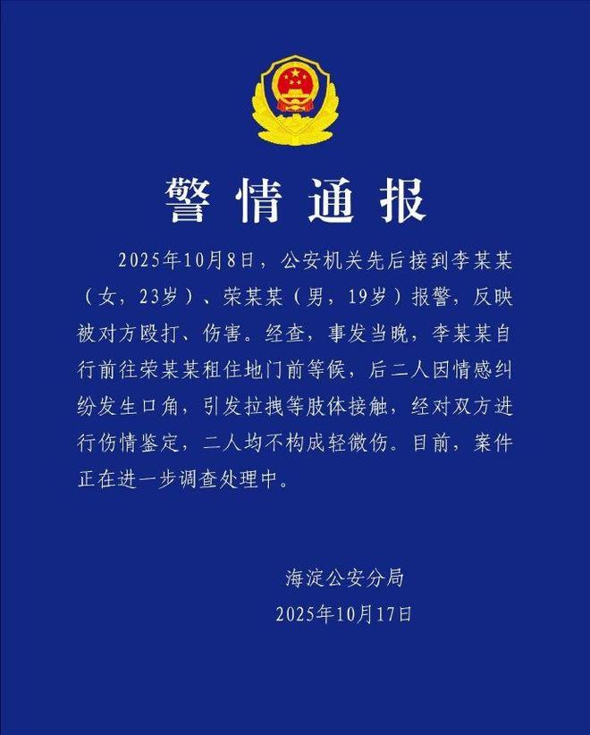 根据警方通报可知,荣梓杉和李禹熹是因为情感纠纷发生口角,引发拉拽等肢体接触。经过伤情鉴定,两人均不构成轻微伤,案件正在进一步调查处理中。