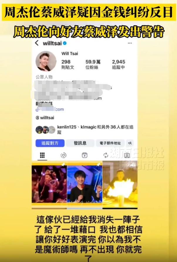 周杰伦发文称蔡威泽“这家伙已经消失一阵子了,找了一堆借口,我也都相信了,还让你好好完成表演” 。